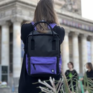 Plecak miejski w kolorze fioletowo pomarańczowym.