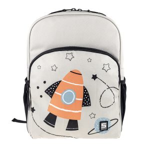Beżowy plecak szkolny z pomarańczową rakietą