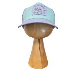 Fioletowo miętowa czapka z daszkiem z siatką z kolorowym emblematem z motylem i kwiatkami