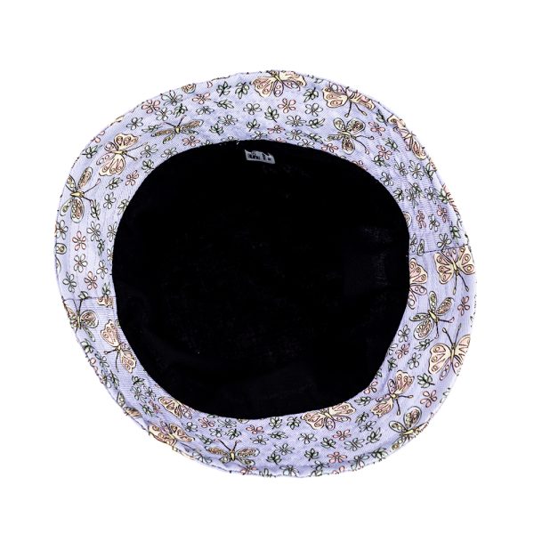 Fioletowy dziewczęcy kapelusz w kolorowe motyle.