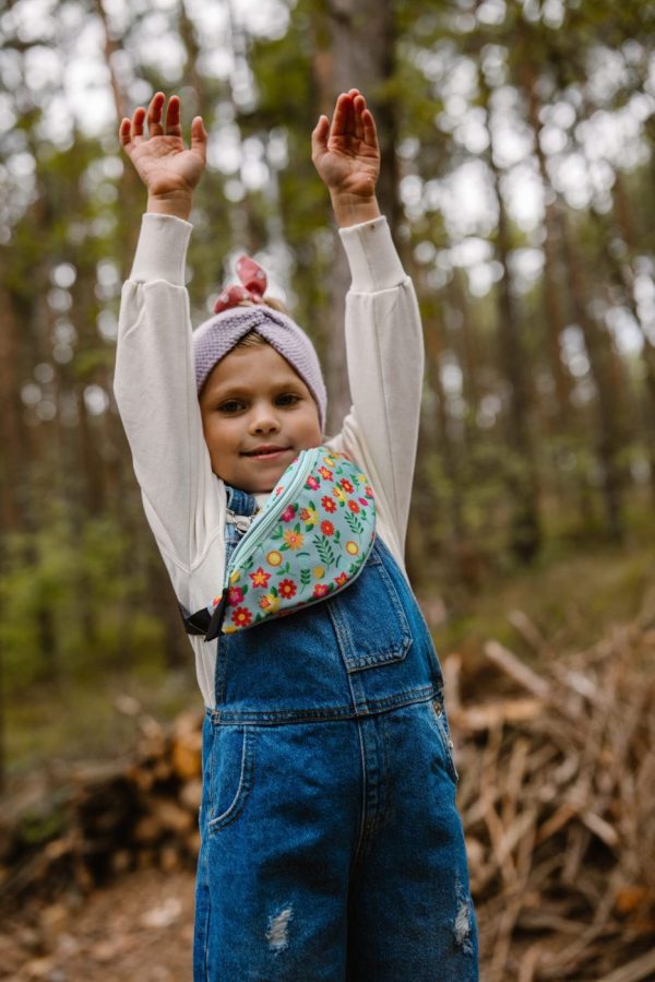 Beżowa mała nerka dziecięca w kolorowe kwiatki.
