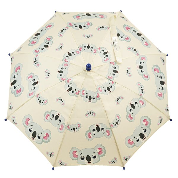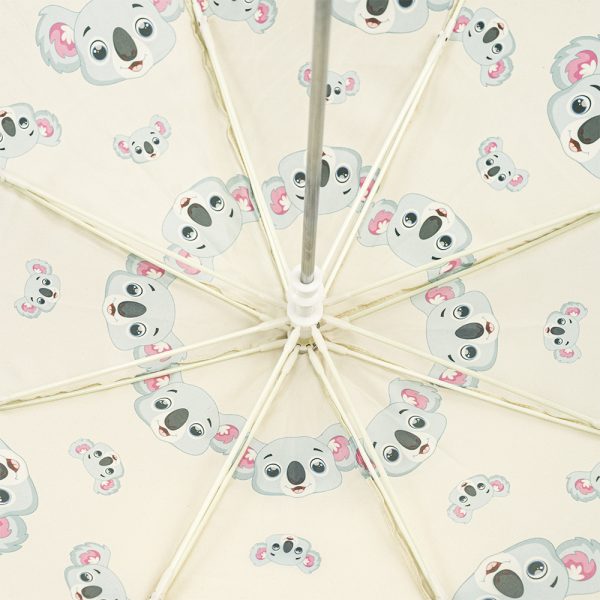Dziecięca parasolka typu laska została solidnie wykończona. Mechanizm parasola umożliwia proste i szybkie otwieranie niesprawiające problemu dziecku w wieku przedszkolnym. Parasol dziecięcy w koale posiada wysoką odporność na podmuchy wiatru. Stelaż wykonano z włókna szklanego, drążek jest stalowy. Beżową parasolkę dziecięcą wykończon okrągłymi plastikowymi końcówkami, co zwiększa bezpieczeństwo w użytkowaniu.