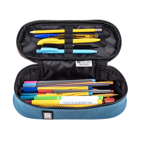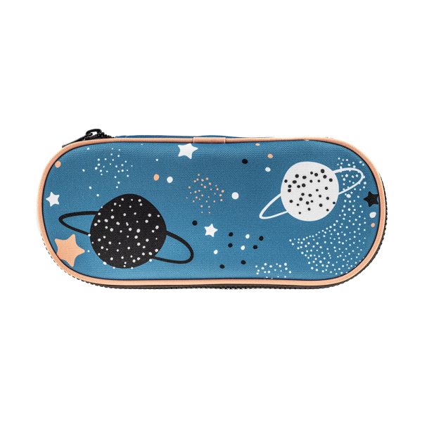 Dziecięcy piórnik w planety na szkolne akcesoria. Idealny dla chłopców interesujących się planetami i kosmosem. Kontrastu nadaje łososiowo pomarańczowa biza i czarny kostkowy zamek. Jest to jednokomorowa wersja piórnika szkolnego. We wnętrzu piórnika znajduje się przestronna komora, która pomieści bardzo dużo elementów wyposażenia szkolnego. Na klapie piórnika od wewnątrz zamontowano gumki, w które można wsunąć najczęściej używane długopisy czy ołówki. Piórnik uszyto z wysokiej jakości wodoodpornego materiału. Nadruk wykonano metodą sublimacji, dzięki czemu kolory są wyraziste i trwałe.