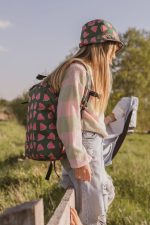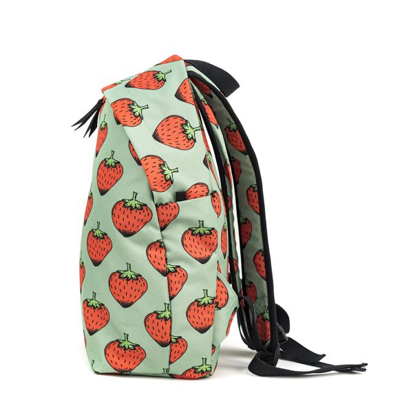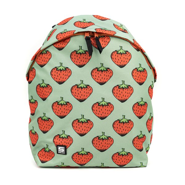 Główna komora zapinana na podwójny zamek kostkowy, który został wykonany w kolorze dobranym pod kolor czerwonej truskawki.