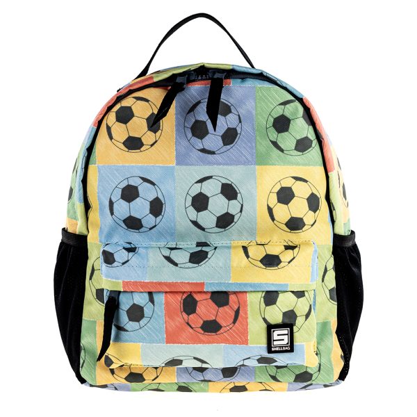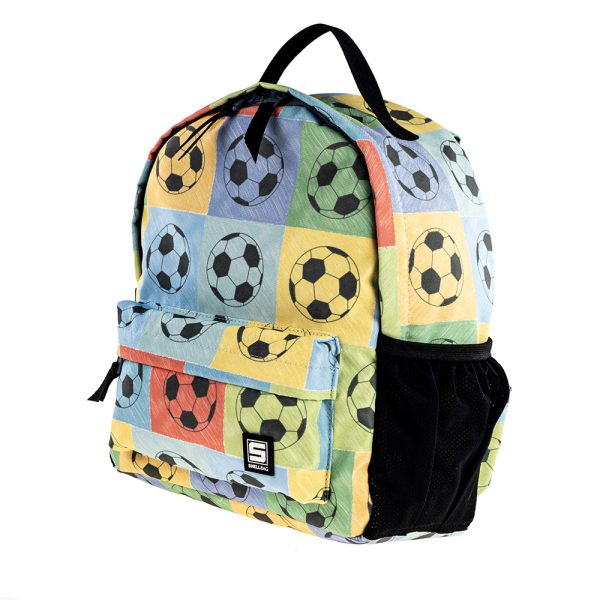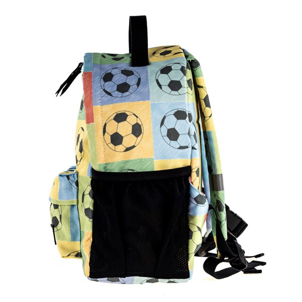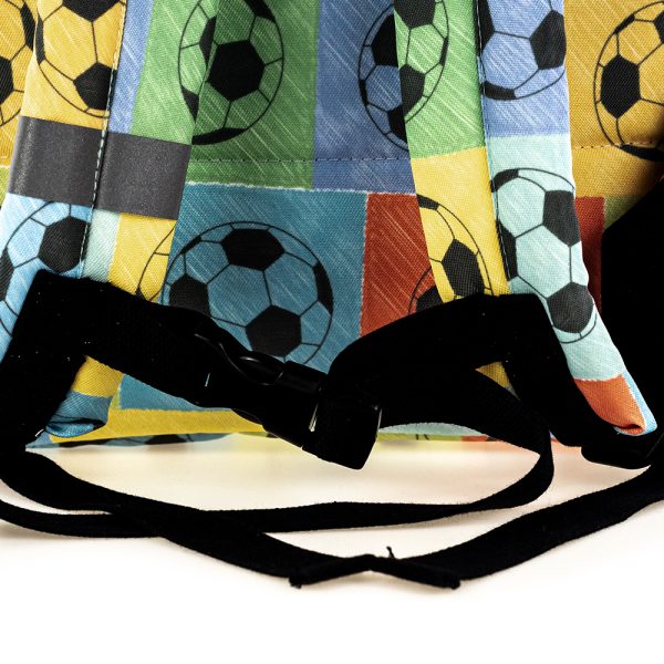 Pojemny plecak przedszkolny w piłki futbolowe.