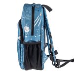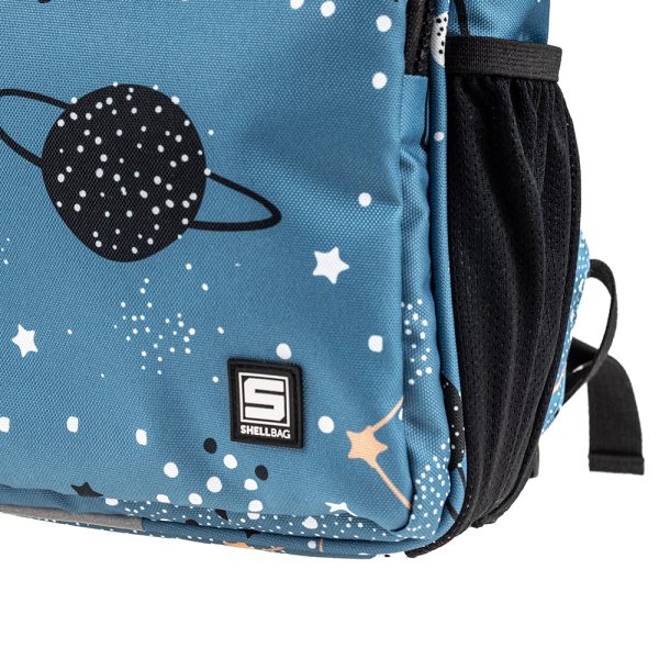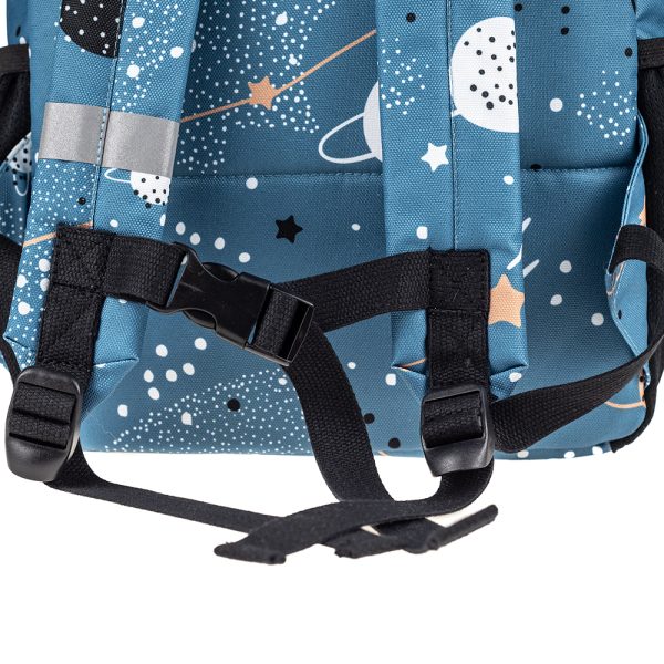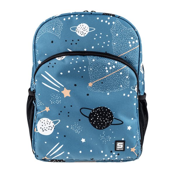 Doskonały plecak do pierwszej klasy. Jest to jednokomorowy niebieski plecak z planetami, wewnątrz posiadający miejsce na podpis właściciela. Na zewnątrz duża komora na zamek, w której zmieści się pojemnik na śniadanie. Główna komora plecaka szkolnego zapinana jest na podwójny zamek kostkowy w czarnym kolorze, mniejsza na pojedynczy. Po bokach wszyto kieszenie z siatki, w których zmieści się bidon. Plecak uszyto z wysokiej jakości wodoodpornej tkaniny. Plecy i szelki plecaka szkolnego usztywniono. Na szelkach zamocowano bawełniane paski piersiowe odciążające plecy. Plecak posiada elementy odblaskowe. Na górze plecaka znajduje się uchwyt do trzymania lub powieszenia. Mieści format A4. Dzięki wysokiej jakości wykonania przez polską szwalnię posłuży dłużej niż tylko przez jeden sezon. Sprawdzi się też jako plecak wycieczkowy.