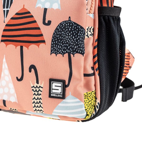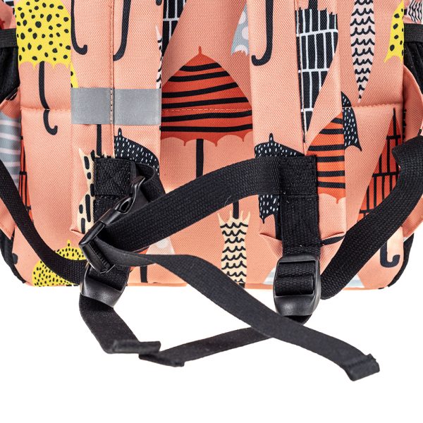 Doskonały plecak do pierwszej klasy. Jest to jednokomorowy pastelowo pomarańczowy plecak w kolorowe pastelowe parasolki, wewnątrz posiadający miejsce na podpis właściciela. Na zewnątrz duża komora na zamek, w której zmieści się pojemnik na śniadanie. Główna komora plecaka szkolnego zapinana jest na podwójny zamek kostkowy w kolorze plecaka, mniejsza na pojedynczy. Po bokach wszyto kieszenie z siatki, w których zmieści się bidon. Plecak uszyto z wysokiej jakości wodoodpornej tkaniny. Plecy i szelki plecaka szkolnego usztywniono. Na szelkach zamocowano bawełniane paski piersiowe odciążające plecy. Plecak posiada elementy odblaskowe. Na górze plecaka znajduje się uchwyt do trzymania lub powieszenia. Mieści format A4. Dzięki wysokiej jakości wykonania przez polską szwalnię posłuży dłużej niż tylko przez jeden sezon. Sprawdzi się też jako plecak wycieczkowy.