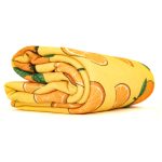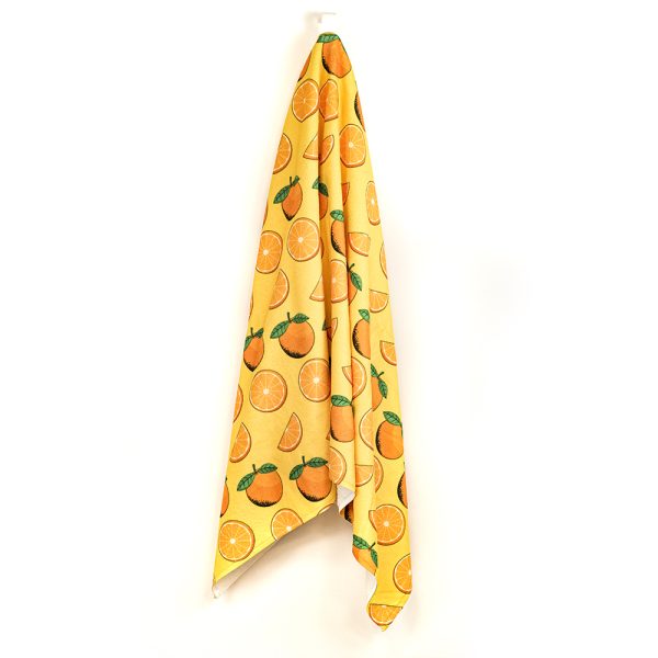 Dziecięcy ręcznik kąpielowy w pomarańcze doskonale sprawdzi się na plaży, basenie lub jako codzienny ręcznik łazienkowy. Duży pomarańczowy ręcznik dla chłopca i dziewczynki i to dobre rozwiązanie podczas wyjazdów ze względu na właściwości szybkoschnące. Ręcznik dobrze chłonie wodę. Ręcznik zabarwiono jednostronnie metodą sublimacji, dzięki czemu nadruk jest trwały i niewyczuwalny w dotyku. Wewnętrzna strona (bez nadruku — biała) to 100% bawełna frotté natomiast zewnętrzna (z nadrukiem) to mikrofibra.