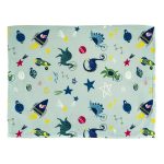 Dziecięcy ręczniczek z lewitującymi w kosmosie dinozaurami doskonale sprawdzi się w przedszkolu jak mały ręcznik do rąk lub po prostu jako osobisty ręczniczek w domowej łazience. Mały błękitny ręcznik dla chłopca to dobre rozwiązanie w podróży. Wewnętrzna strona (bez nadruku — biała) to 100% bawełna frotté natomiast zewnętrzna (z nadrukiem) to mikrofibra. Ręcznik dobrze chłonie wodę. Ręcznik zabarwiono metodą sublimacji, dzięki czemu nadruk jest trwały i niewyczuwalny w dotyku.