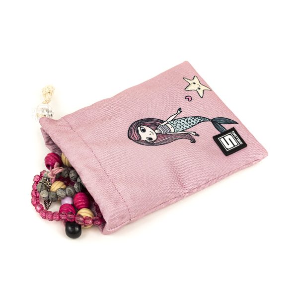 Jednokomorowy różowy woreczek ściągany bawełnianym sznurkiem.