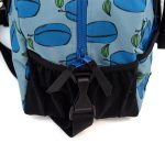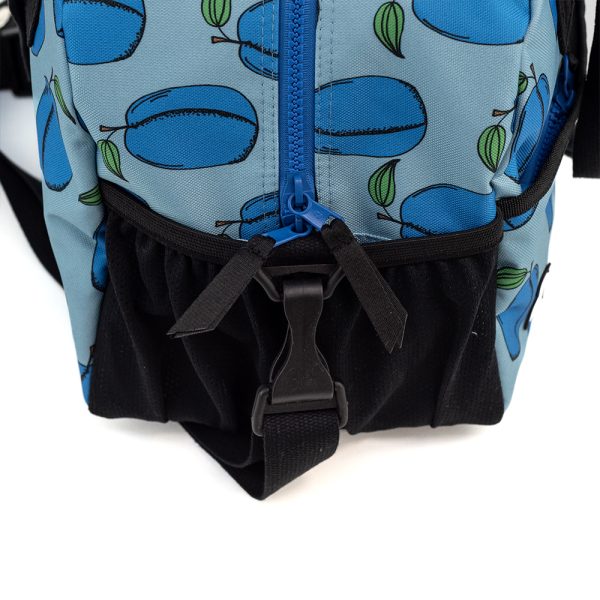 Błękitna torba w niebieskie śliwki to nie tylko rozwiązanie na wyjazdy dla dzieci, ale też doskonałe rozwiązanie dla nastolatków i rodziców — podczas wyjazdów czy zajęć dodatkowych. Jest bardzo pojemna; zmieści wszystko, co potrzebne podczas wyjścia na basen, podczas weekendowego wyjazdu do babci. Dzięki swojej elastyczności może być bagażem podręcznym podczas podróży samolotem. Sportowa torba w śliwki może być używana już od najmłodszych lat – zmieści zapas pieluch butelek czy odzieży na zmianę. Torba sportowa jest łatwa w utrzymaniu czystości – można prać ją w pralce wg instrukcji na metce. Użyty w niej materiału i wykonanie bardzo wysokiej jakości. Torba posiada jedną komorę główną zapinaną na plastikowy zamek kostkowy, zewnętrzną kieszeń na podręczne rzeczy i po bokach 2 pojemne kieszenie z siatki. Torba sportowa posiada szeroki regulowany bawełniany pas i rączki z możliwością spięcia. Do wykonania torby wykorzystano nadruk sublimacyjny, który jest niewyczuwalny w dotyku i jednocześnie bardzo trwały.