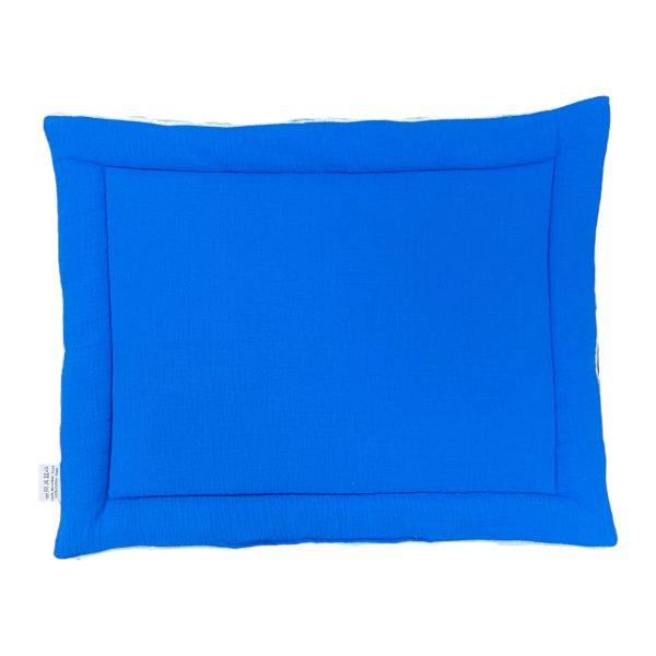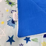 - Uszyty z miękkiego, dwuwarstwowego muślinu w kolorze dopasowanym do wzoru kocyka.
